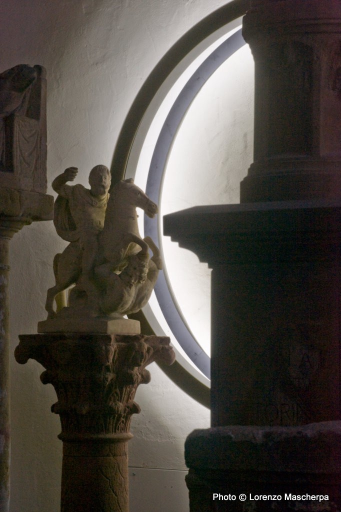 Al centro della navata destinata all’esposizione dei reperti appartenenti al periodo romano, un gruppo di colonne, basamenti e capitelli giacciono posati su una pedana metallica. Dalla parete retrostante un grande anello di luce dinamica, bianca e argentea, domina e scansiona le colonne rivelandone la forma, la materia, l’origine. L’anello, fin dai tempi dell’antica Roma, simboleggia l’eternità. Intermittenze e bagliori, emanati da Anulus, creano un magnetico e catalizzatore “polo di luce” misterioso ed enigmatico, che attraverso una sequenza di scie luminose irrompe nello spazio. Un sofisticato sistema di controllo gestisce le variazioni di luce diretta e indiretta, che si irradiano nell’ambiente come provenienti dalle profondità dello spazio e del tempo.